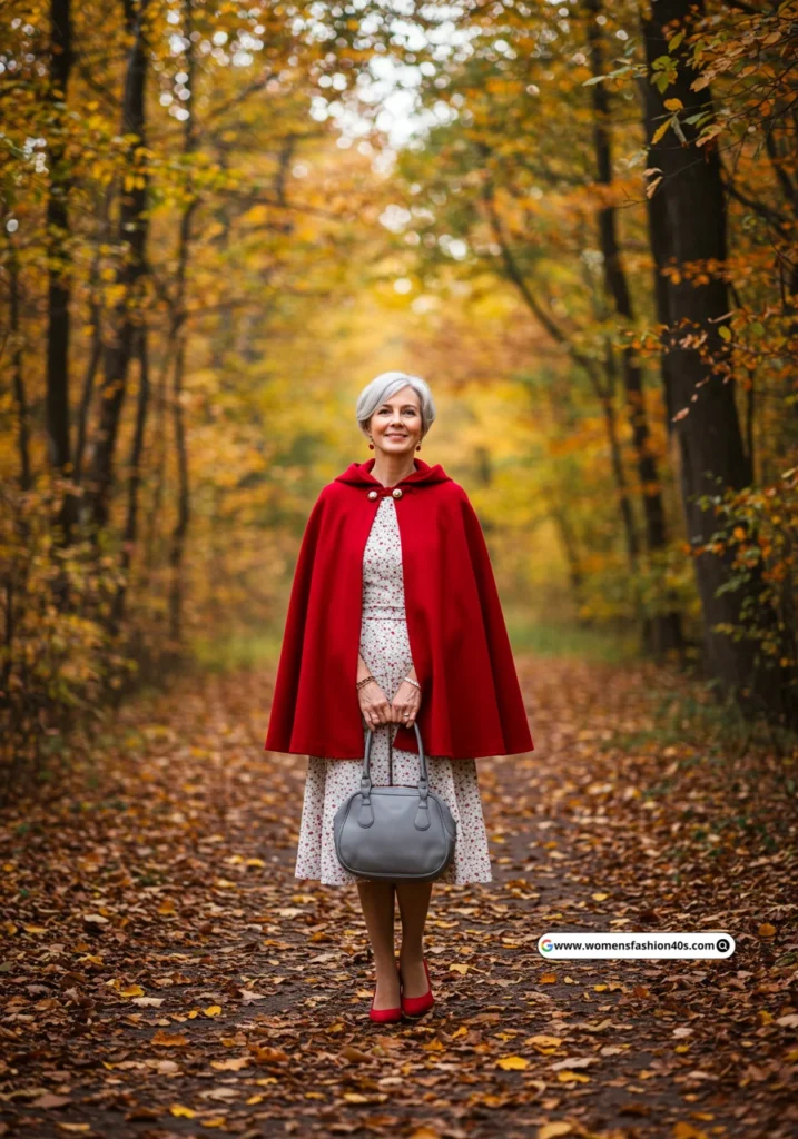 Shop Now from Amazon: Red Cape + White Dress + Gray Wolf Suit + Red Shoes + Gray Bag