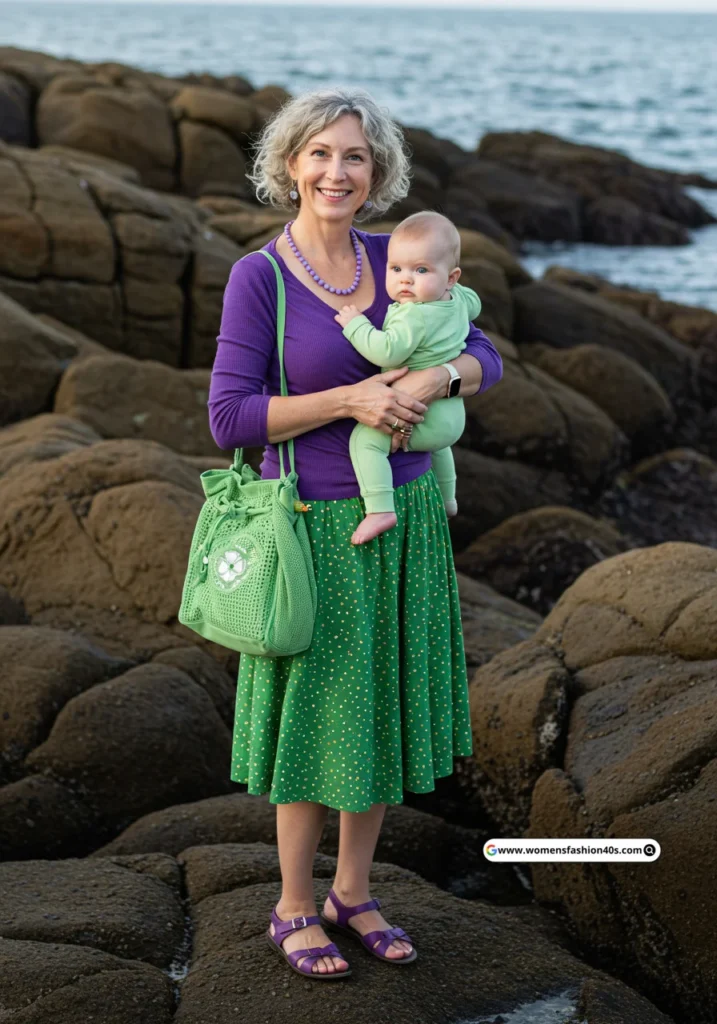 Shop Now from Amazon: Purple Top + Green Skirt + Green Baby Outfit + Purple Shoes + Green Bag