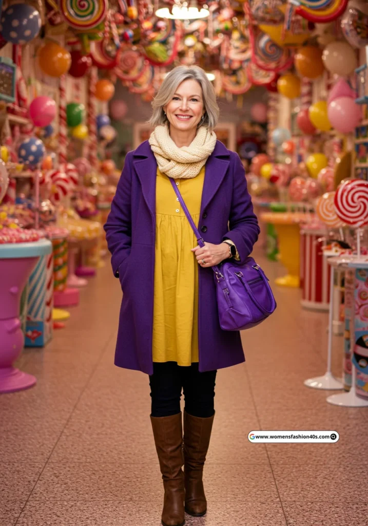 Shop Now from Amazon: Purple Coat + Black Pants + Yellow Dress + Brown Boots + Baby Oompa Outfit + Purple Bag