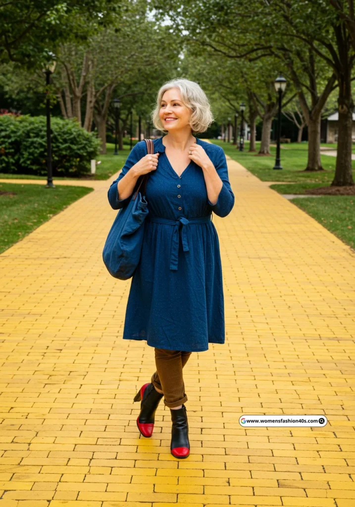 Shop Now from Amazon: Blue Dress + Brown Pants + Black Boots + Baby Dog Romper + Red Shoes + Blue Bag