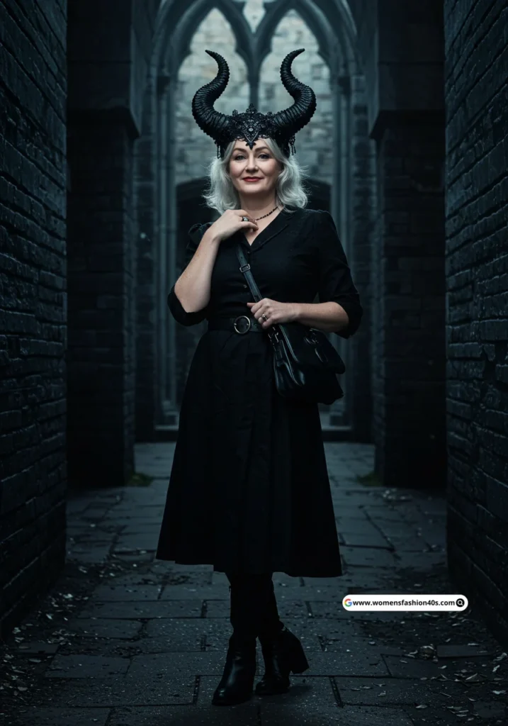 Shop Now from Amazon: Black Horned Headpiece + Black Dress + Baby Dark Outfit + Black Boots + Black Bag