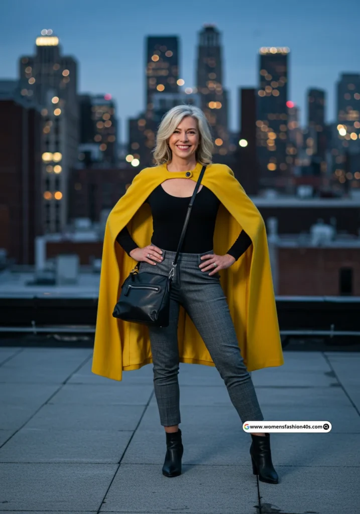 Shop Now from Amazon: Black Bodysuit + Gray Pants + Black Boots + Yellow Cape + Black Bag