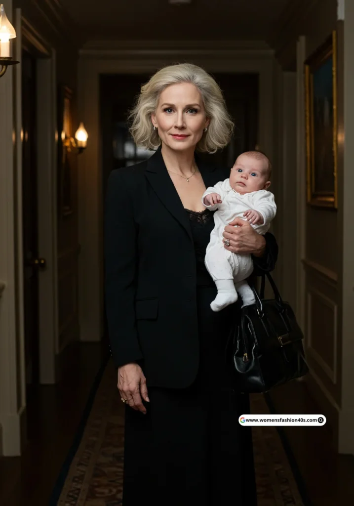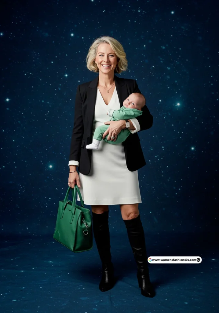 Shop Now from Amazon: Black Suit + White Dress + Green Baby Outfit + Black Boots + Green Bag