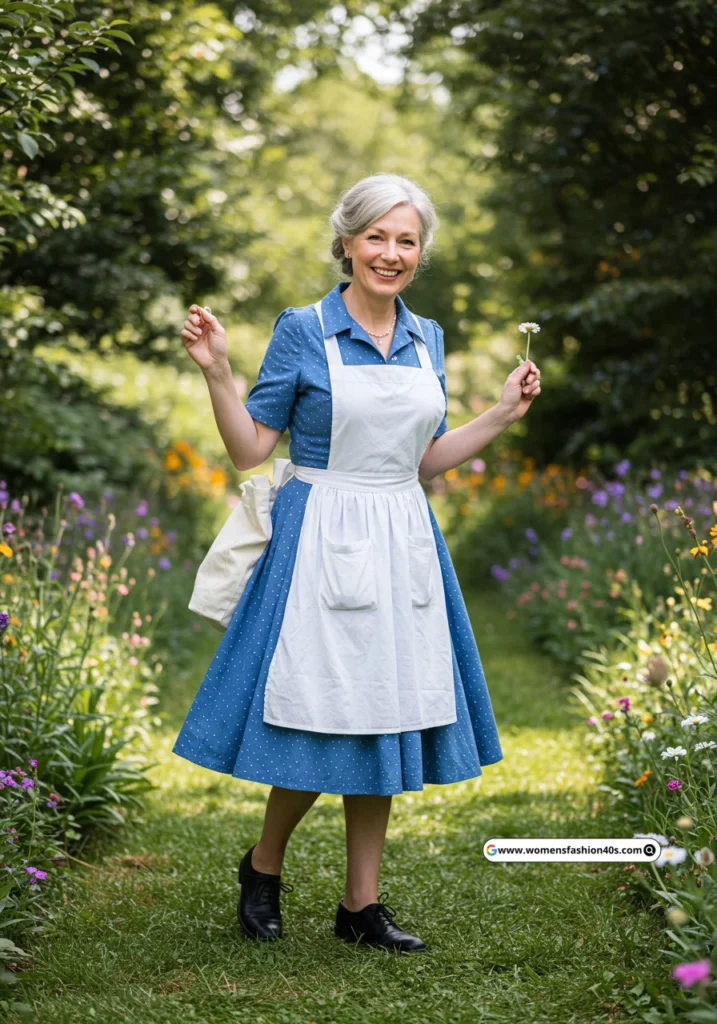 Shop Now from Amazon: Blue Dress + White Apron + Black Pants + Black Shoes + White Bag