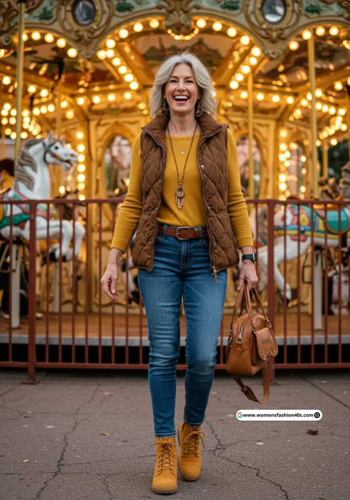 Shop Now from Amazon: Brown Vest + Yellow Shirt + Jeans + Yellow Boots + Brown Bag