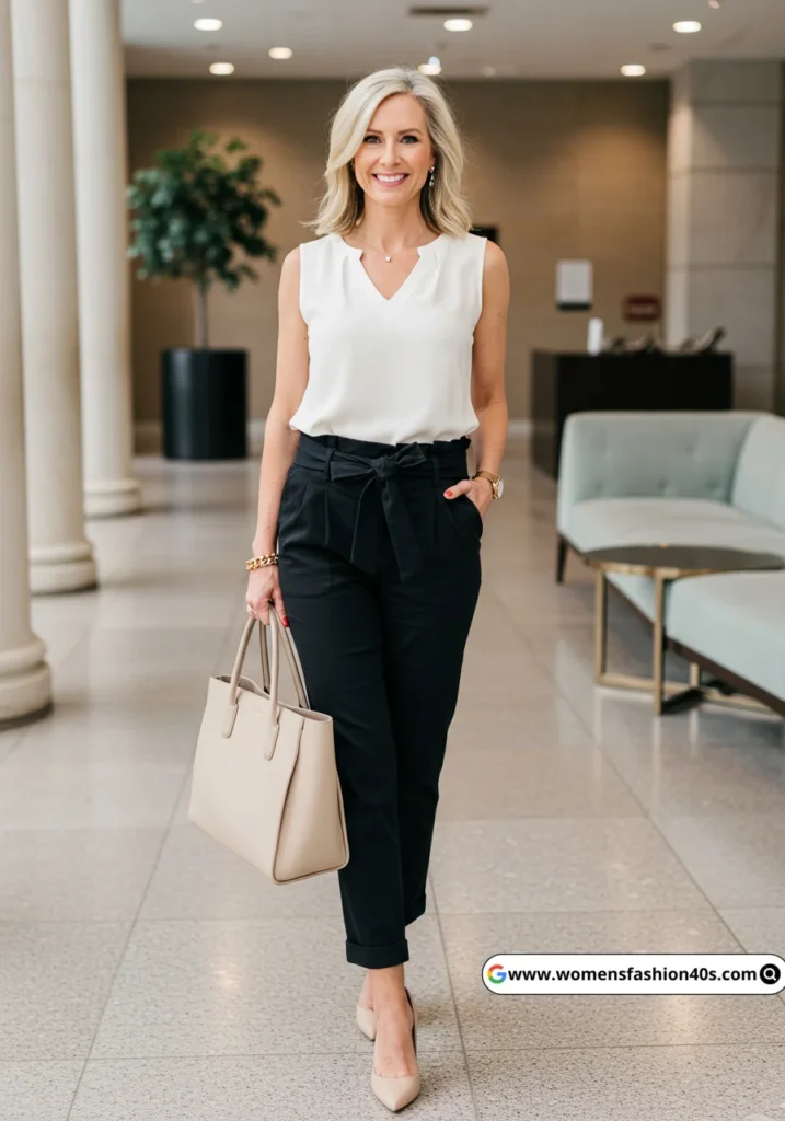 When I first paired black paperbag pants with a crisp white blouse, I felt polished yet comfortable. Pinterest Trends shows a 40% increase in searches for “black paperbag pants outfits” among women over 40, confirming classic pieces are timeless.