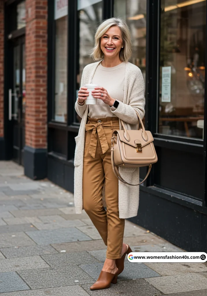 This brunch outfit is cozy and approachable. Pinterest shows camel pants paired with neutrals are increasingly popular among women 40+ for effortless layering.