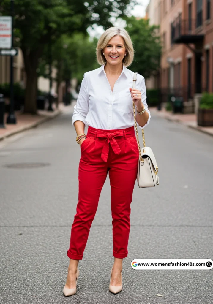 I felt bold and confident wearing red pants. Statista reports colorful bottoms are trending for women over 40, showing age doesn’t limit experimenting with vibrant tones.