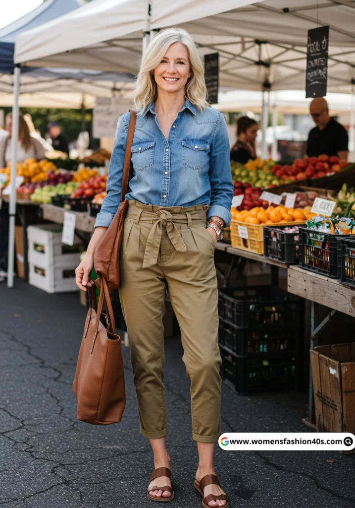 [Shop Now from Amazon: Khaki Paperbag Pants + Blue Denim Shirt + Brown Sandals + Brown Tote Bag]