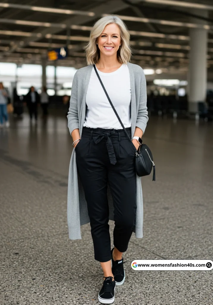 Traveling comfortably yet stylishly is easy with this outfit. Pinterest highlights “airport outfits over 40” featuring paperbag pants for practicality and style.