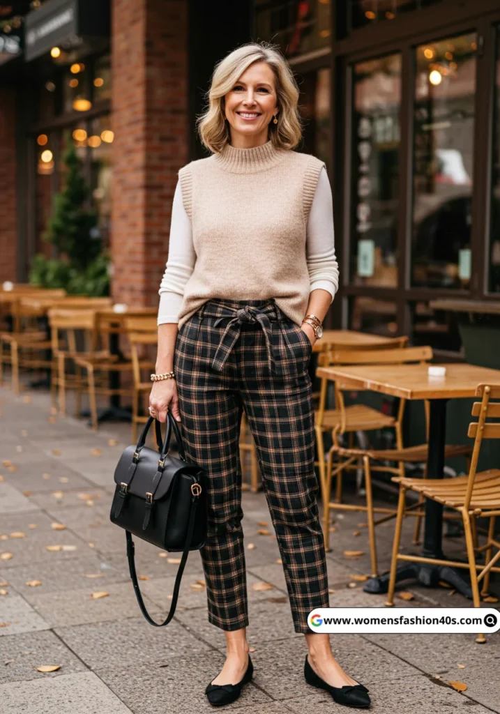 Perfect for fall gatherings, sweater vests add a layered, elegant touch. Google Trends shows “sweater vest outfit over 40” gaining interest in the last year.