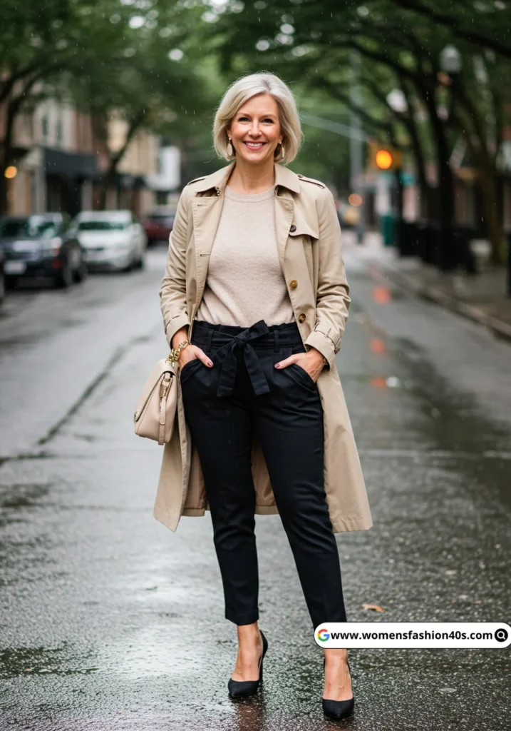 Rainy days don’t compromise style. Pinterest highlights “trench coat + paperbag pants” as a top transitional season outfit for women 40+.