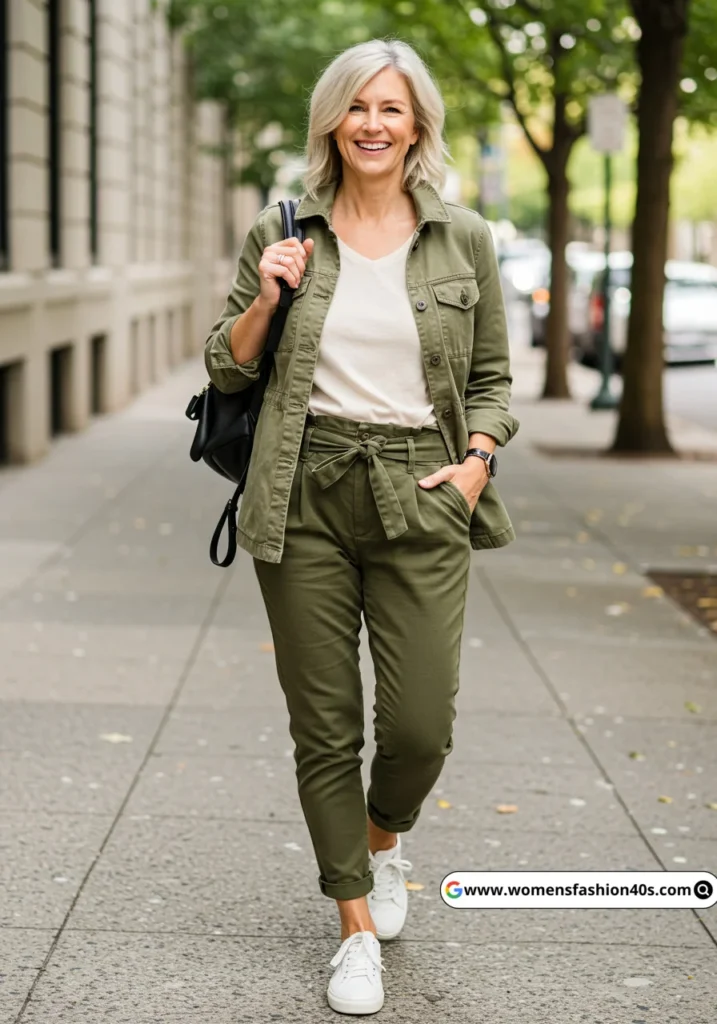 Casual errands have never looked so stylish. Pinterest highlights “utility jacket with paperbag pants” as trending for mature women seeking practical yet chic outfits.