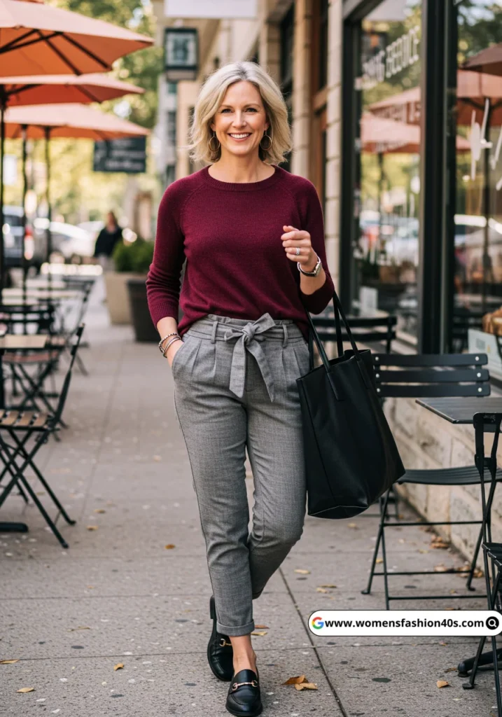 [Shop Now from Amazon: Grey Paperbag Pants + Burgundy Sweater + Black Loafers + Black Tote Bag]