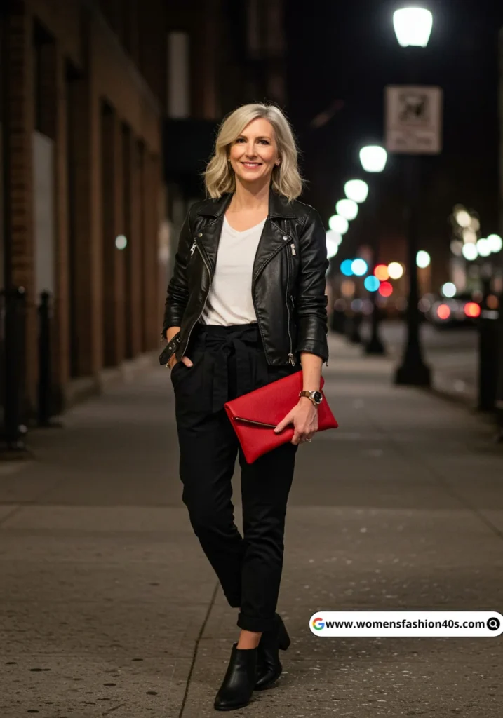 Pairing with a leather jacket gave me instant confidence for a night out. Pinterest reports a 30% rise in “paperbag pants leather jacket outfits” among women 40+.