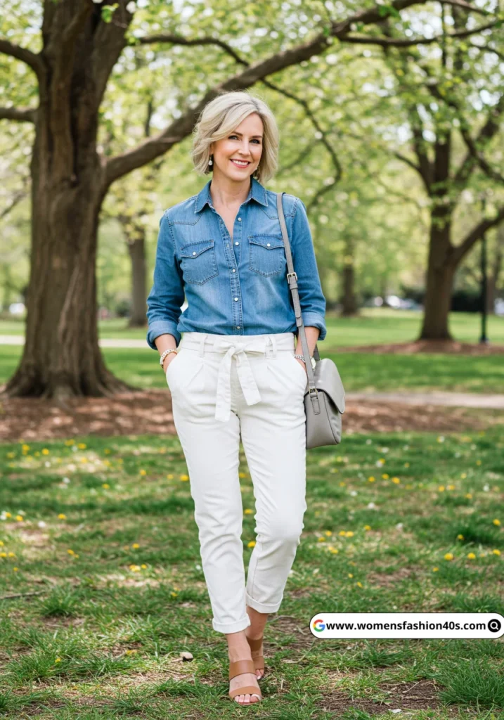 White pants felt intimidating at first, but chambray balanced the outfit beautifully. Google Trends shows spring searches for “white paperbag pants outfit” spike annually.