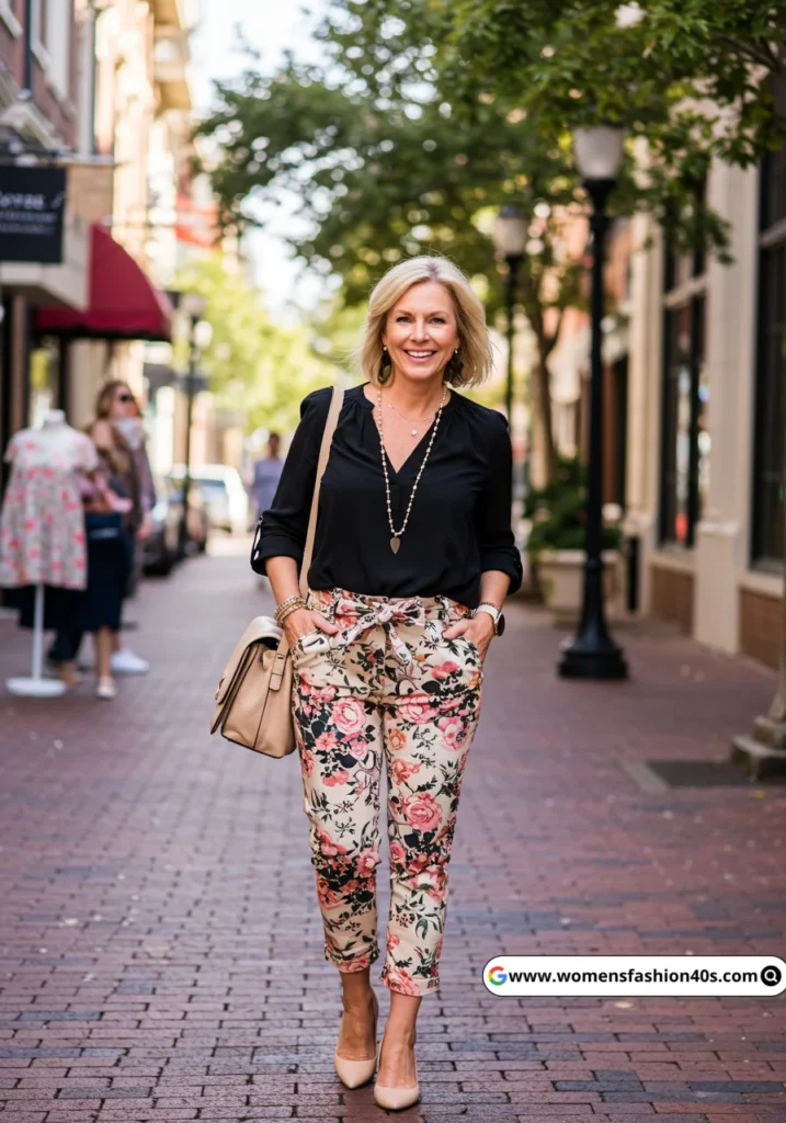 Bold prints used to intimidate me, but pairing with a neutral top made it easy. Pinterest indicates growing interest in “printed paperbag pants over 40” for a fun yet chic style.