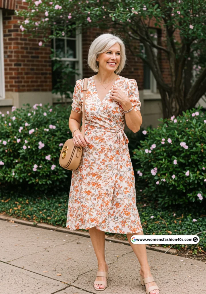 Shop Now from Amazon: Floral Wrap Dress + Beige Sandals + Tan Crossbody Bag