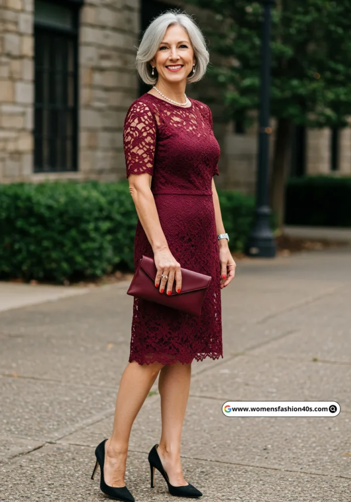 This burgundy lace midi dress was both romantic and refined, making it ideal for a formal dinner.