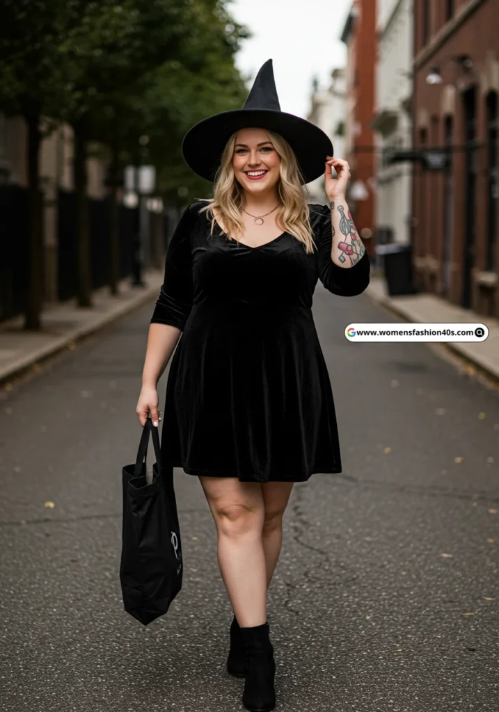 Wearing this witch costume in New York felt empowering and fun. Pinterest Trends 2024 shows searches for “plus size witch costumes” up 60%, and Statista confirms that gothic-inspired solo looks remain a top choice for plus-size adults.