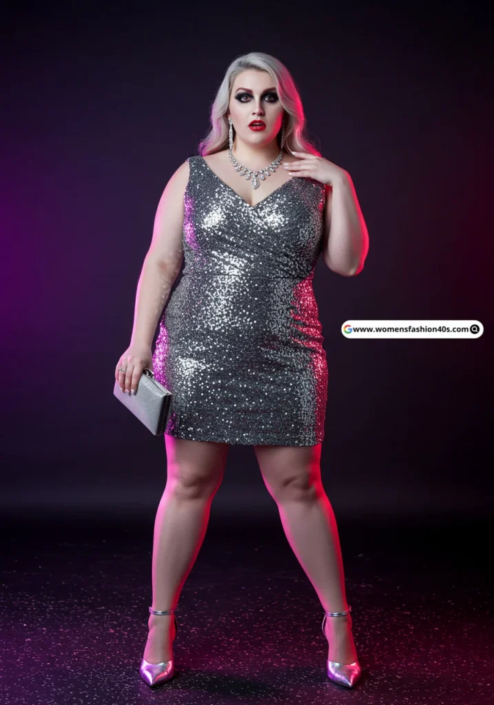 Shop Now from Amazon: Silver Sequin Dress + Silver Heels + Silver Clutch
