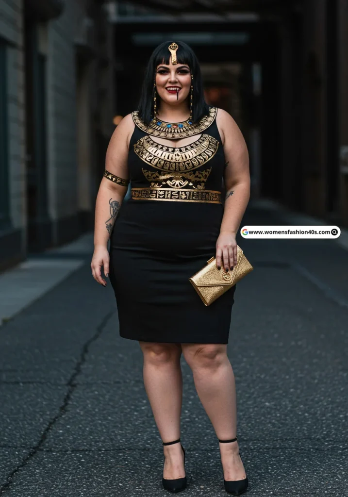 Los Angeles nights were regal with this Cleopatra costume. Vogue notes that historical-inspired plus-size costumes are gaining popularity for dramatic Halloween flair.
