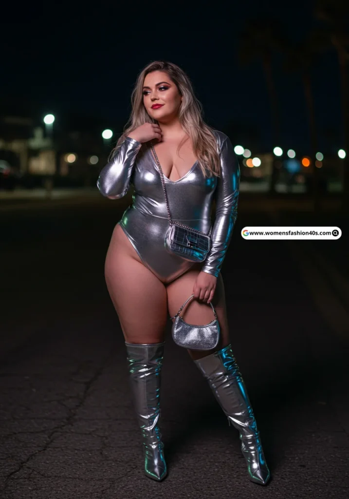 Shop Now from Amazon: Metallic Silver Bodysuit + Silver Boots + Silver Mini Bag