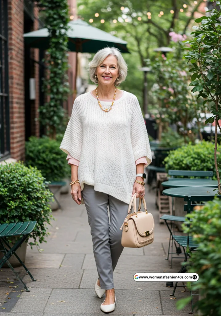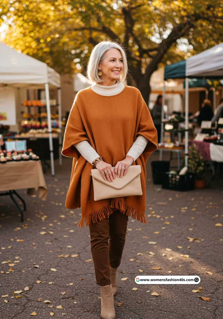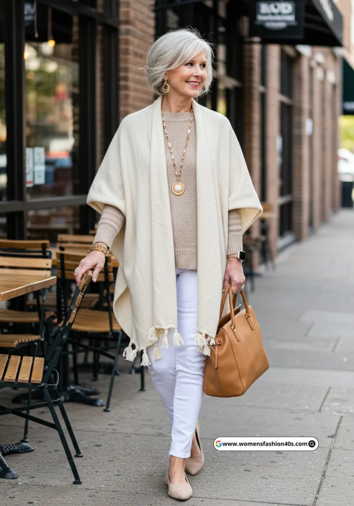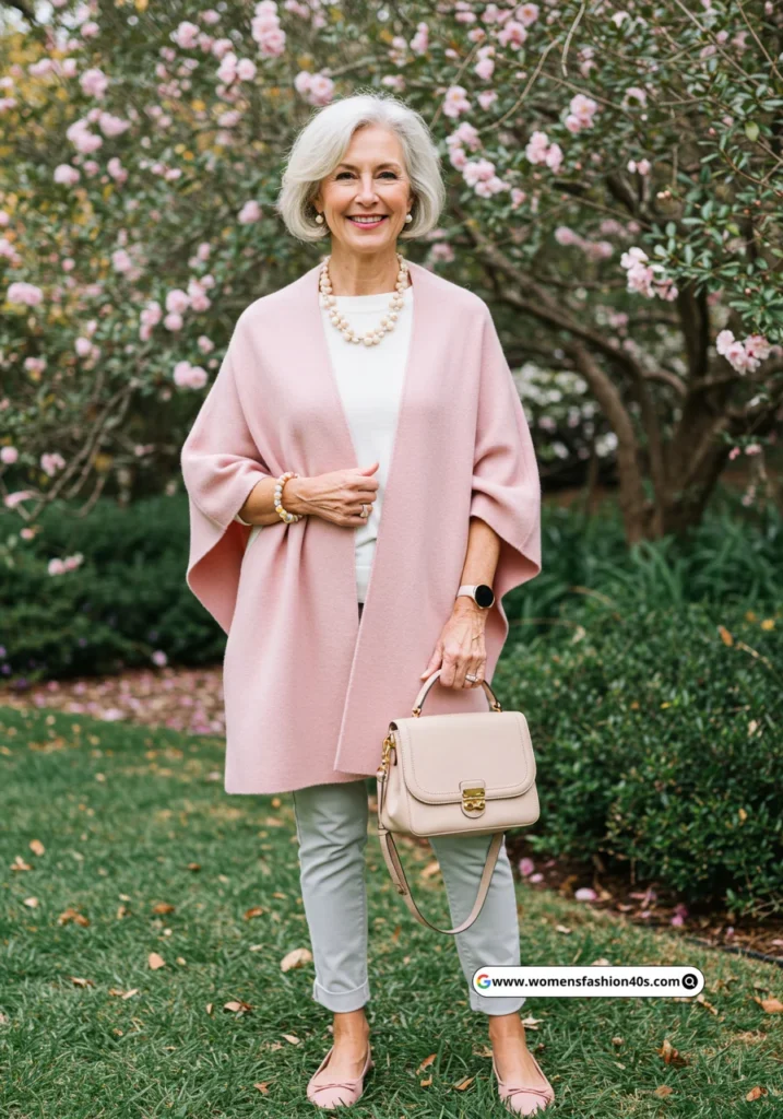 Soft pastels paired with white ponchos created such a fresh spring vibe for brunch in Boston. Google Trends highlights rising interest in pastel ponchos among women over 60 seeking softer, elegant looks.