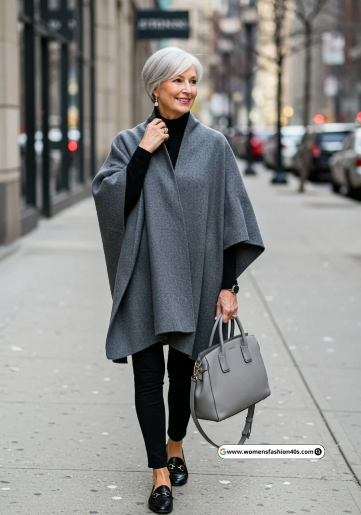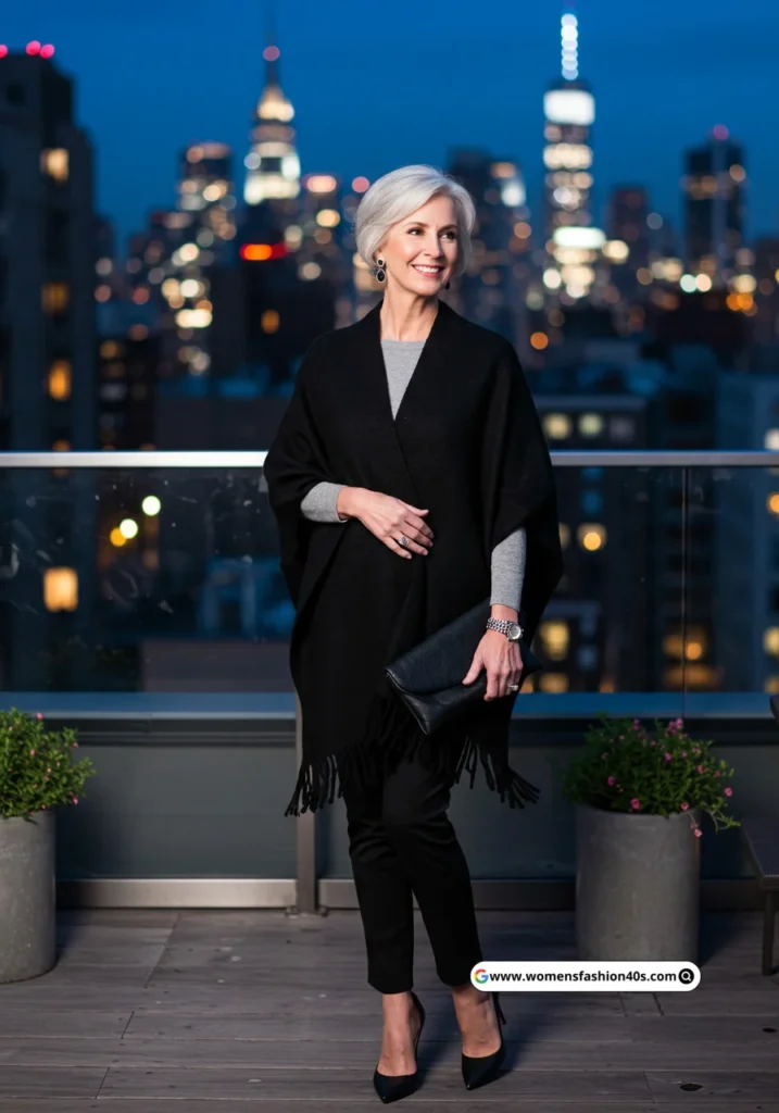 This sleek black poncho outfit worked perfectly for an evening event in New York. Monochrome looks remain a strong trend in mature women’s fashion, offering sophistication with minimal effort.