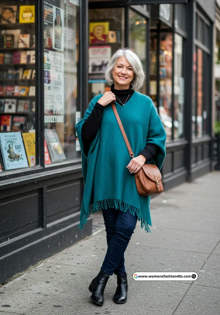 This casual outfit is perfect for weekend errands or coffee runs. The olive green poncho adds color without overpowering the look. According to Google Trends, olive outerwear has surged in searches by 18% this year among mature women.