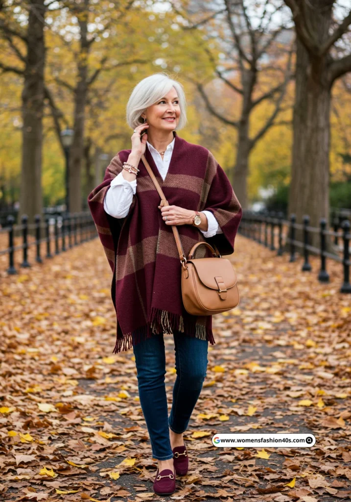 This burgundy plaid poncho became my ultimate go-to for fall outings in Boston. The vibrant pattern added personality while keeping the outfit elegant. Pinterest data shows plaid ponchos trending upward for women over 60 looking for stylish layering pieces.