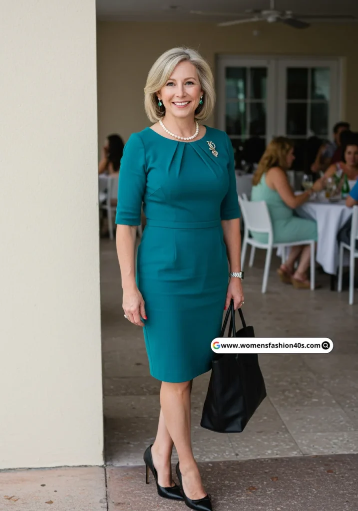 This teal sheath worked beautifully for a Miami lunch. Pinterest shows teal dresses trending among over-40 women in 2025, and black heels added timeless sophistication.