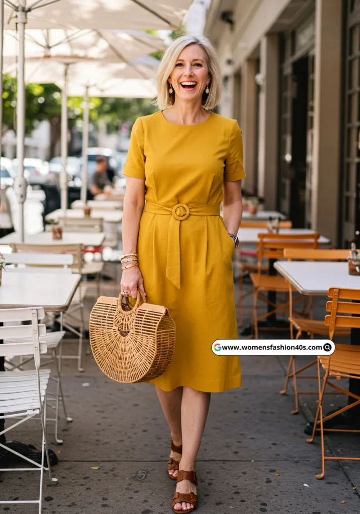 I wore this bright mustard sheath in Los Angeles for an outdoor brunch. Pinterest highlights mustard shades as trending for fall 2025. Brown sandals and a woven bag made it perfect for casual outings.