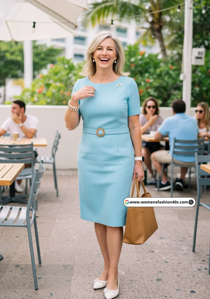 This sky blue sheath brought fresh spring vibes to a Miami brunch. Pinterest shows sky blue shades trending among over-40 women. White flats kept the outfit light and chic.