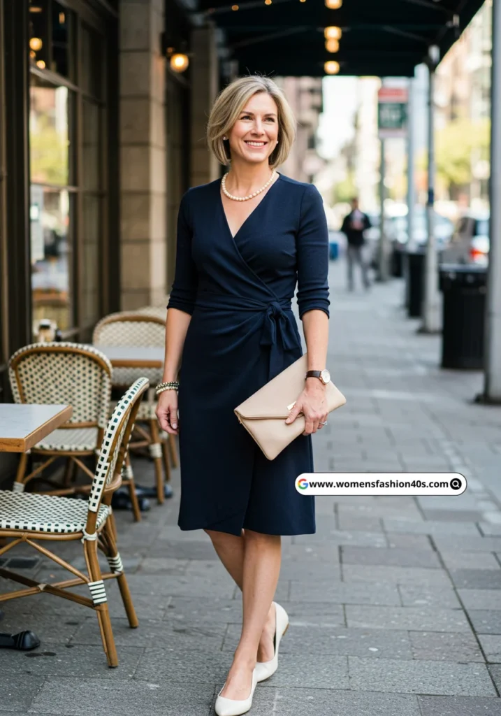 I wore this navy wrap sheath in Seattle for a daytime brunch. Statista notes wrap-style sheath dresses as a rising trend for women over 40. White flats and a beige clutch kept it casual yet chic.