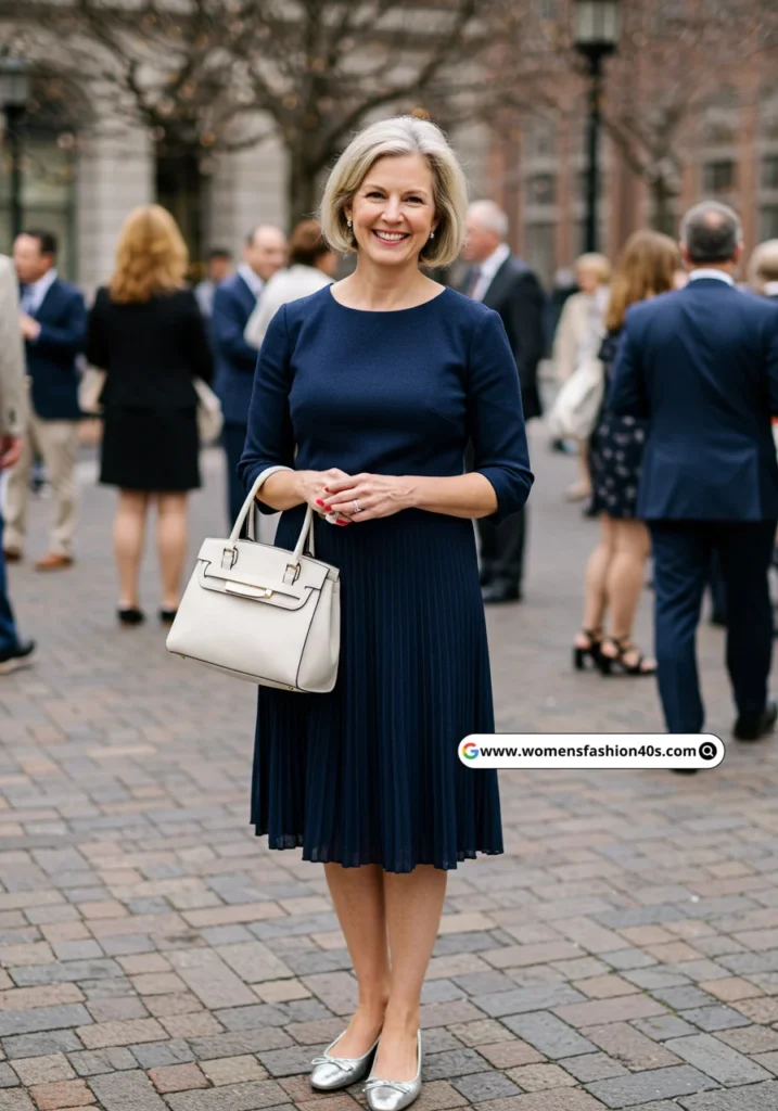 Pleats add movement and sophistication. I wore this for a daytime Boston gathering. Pinterest shows pleated sheath dresses trending among over-40 women, combining elegance with effortless style.