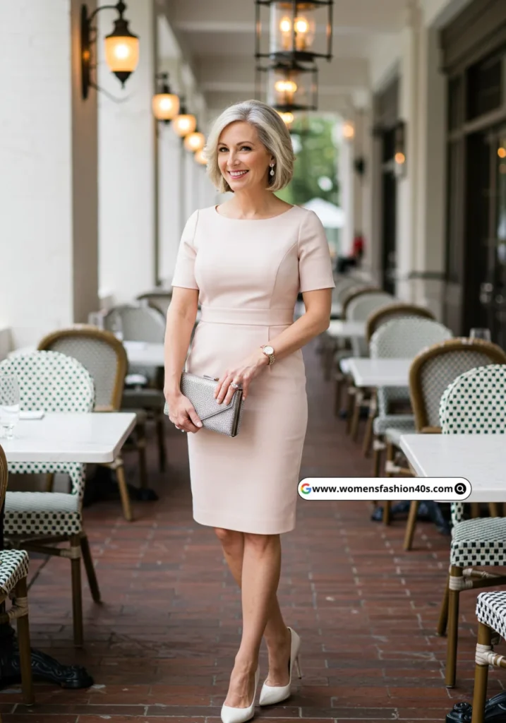 This soft blush sheath felt perfect for a brunch in Atlanta. Google Trends shows blush pink as a trending color for over-40 women in 2025, and the silver clutch added subtle elegance.