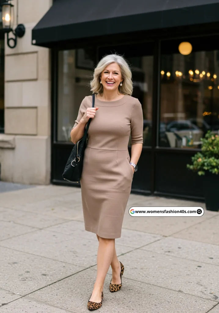 Leopard print flats make a taupe sheath playful yet approachable. I wore this in Chicago for casual lunch dates. Statista reports leopard prints as increasingly popular for women over 40.
