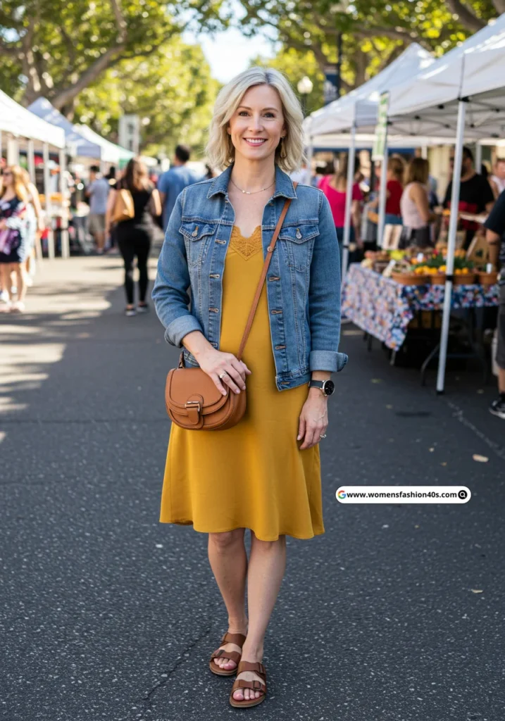 This outfit was perfect for a weekend market visit. The mustard yellow dress was cheerful and eye-catching, while the denim jacket added a casual touch. Brown sandals and a matching crossbody bag completed the look.