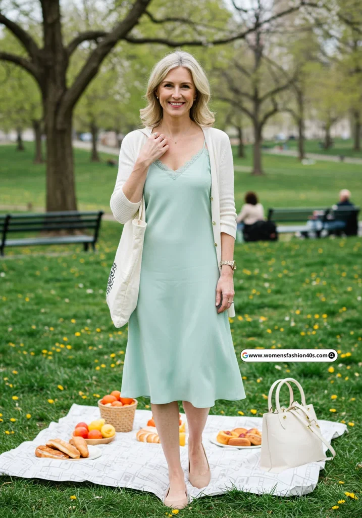For a spring picnic, this outfit was both fresh and comfortable. The mint green dress was light and airy, and the white cardigan added warmth. Nude flats and a white tote bag completed the ensemble.