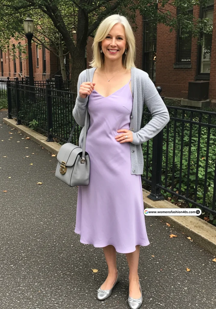Wearing this lavender dress to a book club meeting was a delight. The soft color was calming, and the grey cardigan added warmth. Silver flats and a matching crossbody bag completed the ensemble.