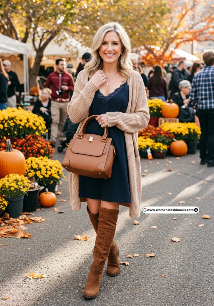 This outfit was my choice for a fall festival. The navy blue dress with a subtle side slit was both flattering and comfortable. Layering with a tan cardigan and pairing with knee-high boots added warmth and style, while the satchel held all my essentials.
