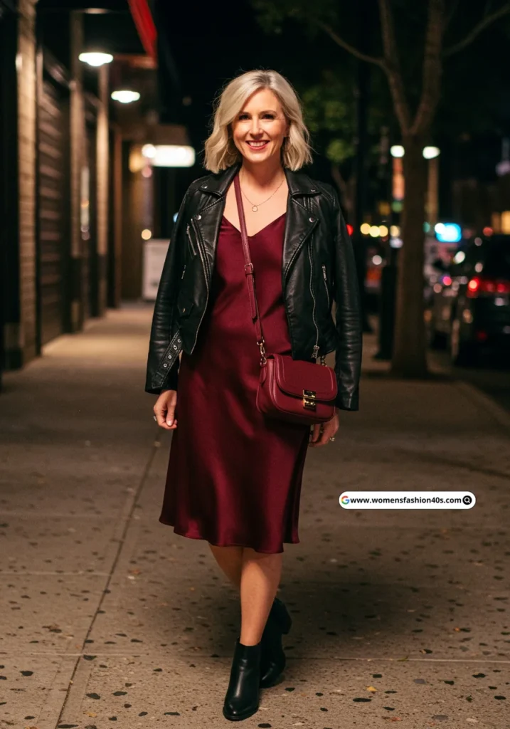 This ensemble became my go-to for evening outings. The satin slip dress offers a timeless silhouette, while the leather jacket adds an edgy contrast. Paired with ankle boots and a sleek crossbody, it’s a look that transitions effortlessly from dinner to drinks.