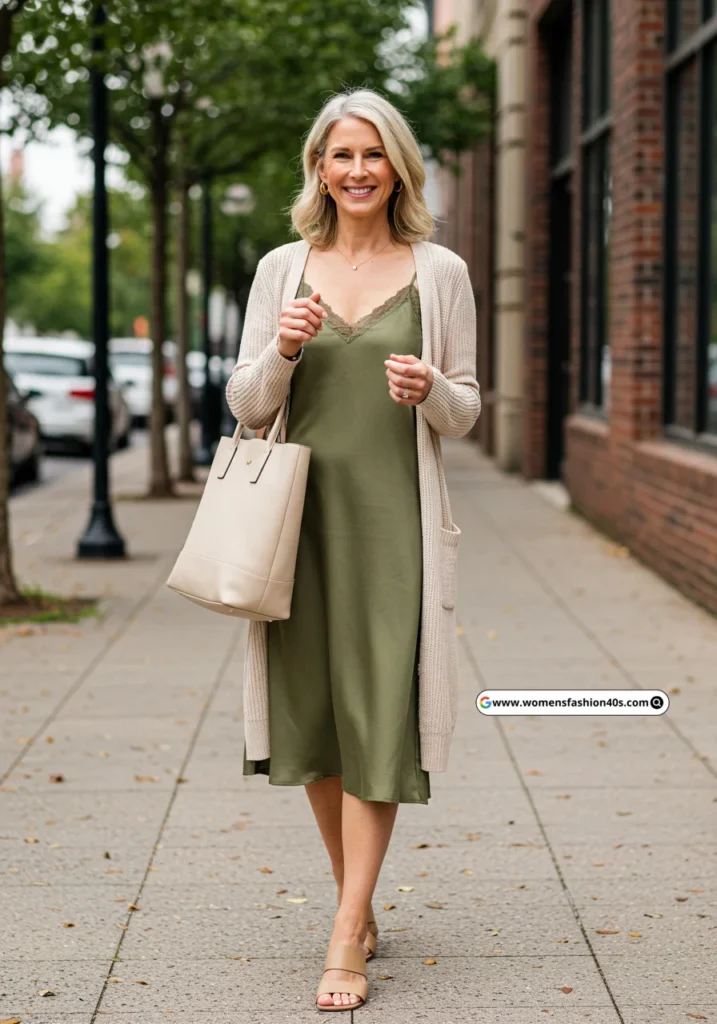Olive Green Slip Dress + Beige Cardigan + Tan Sandals + Beige Tote Bag