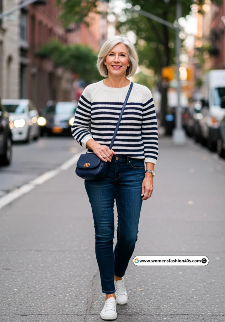 On my first trip to New York City, this outfit made sightseeing easy and stylish. The soft knit sweater added a chic Parisian vibe, while the skinny jeans gave structure and ease. Google Trends highlights striped knits as a favorite for mature travelers seeking effortless layers.