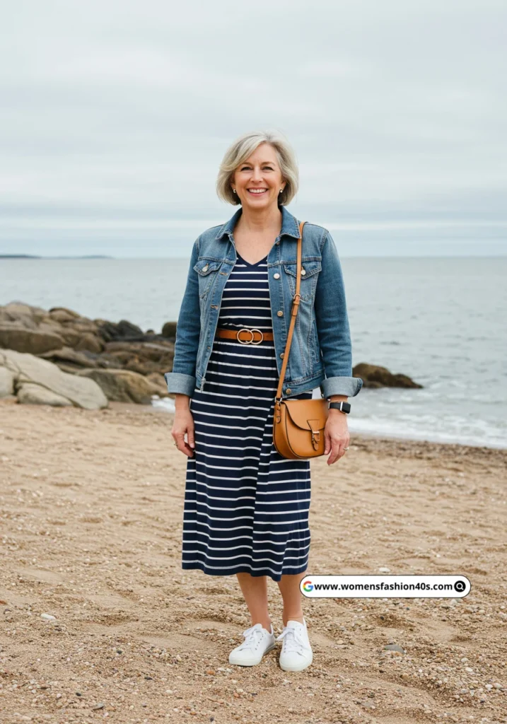 Walking along the New England coastline, this striped dress paired with a denim jacket was both stylish and practical. The light layers made it easy to adjust to changing temperatures. Statista highlights that classic stripes remain a top choice for travel outfits for women over 50.