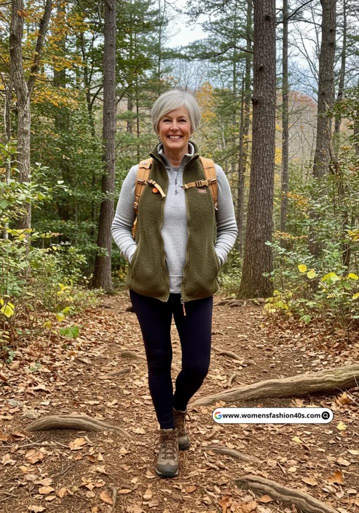 Hiking in the Smoky Mountains, this outfit kept me warm without bulk. The fleece vest was practical yet stylish, and the leggings allowed unrestricted movement. Pinterest searches indicate fleece vests are trending among mature women for active travel.