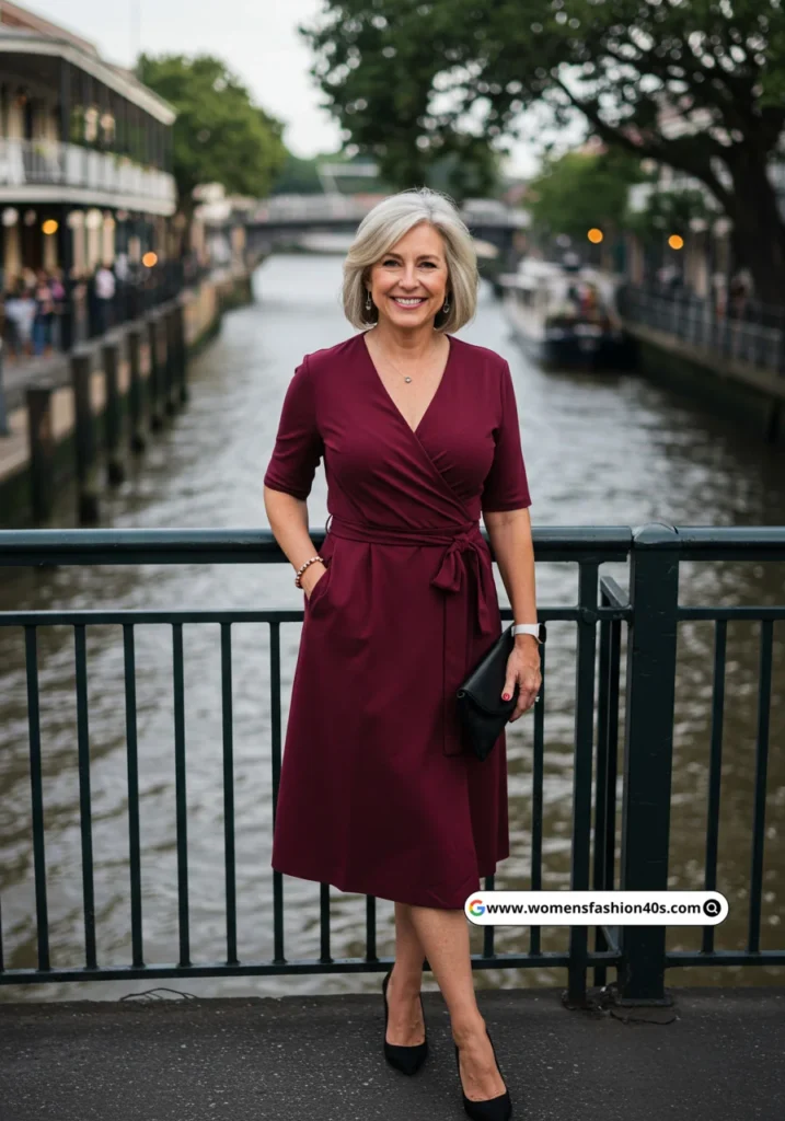 For an evening river cruise in New Orleans, the wrap midi dress was both flattering and comfortable. The rich burgundy tone stood out against the city lights, and the wrap style accentuated my waist beautifully. Vogue emphasizes wrap dresses as timeless pieces for women over 50 attending evening events.