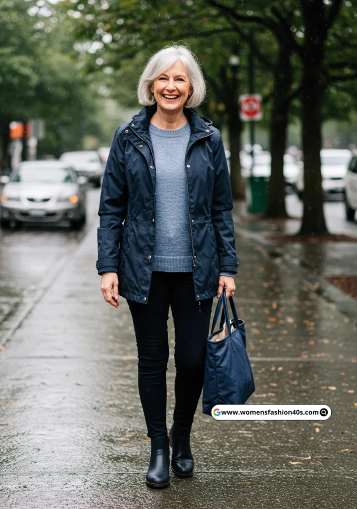 Top: Navy Waterproof Jacket + Bottom: Black Stretch Pants + Footwear: Waterproof Ankle Boots + Bag: Navy Tote