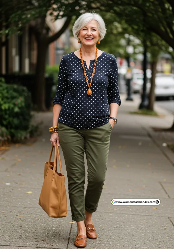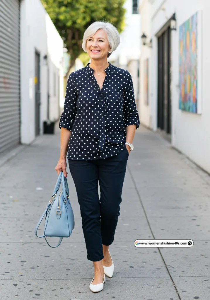 I wore this for a casual gallery walk in Portland. Polka dots are a Pinterest favorite, creating playful yet sophisticated looks for women over 60 who love fun patterns without being too bold.